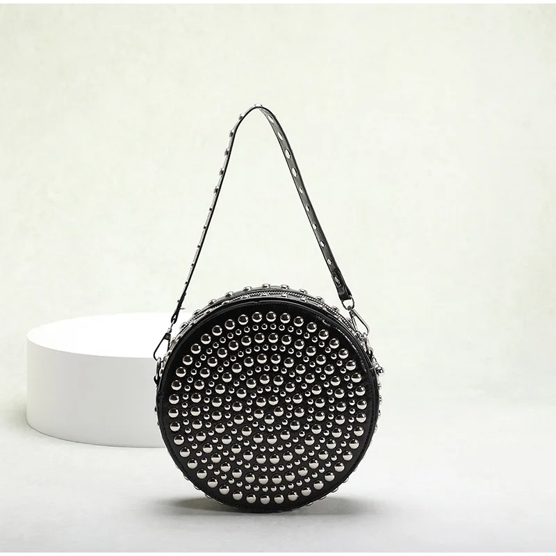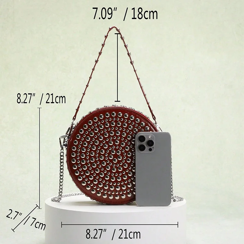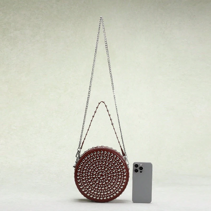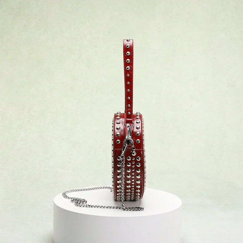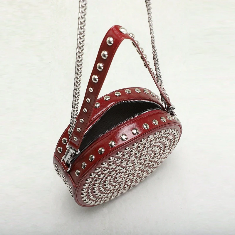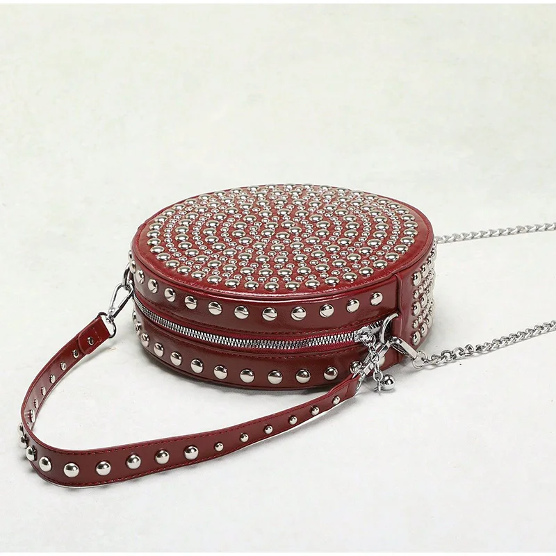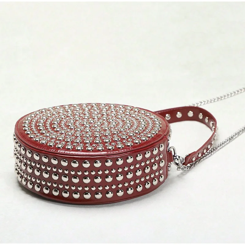 Full Rivet Round Bag Double-sided Tire Niche Brand Chain Unique Wine Red All-match Photo Cool Drum Ladies Crossbody Underarm Bag